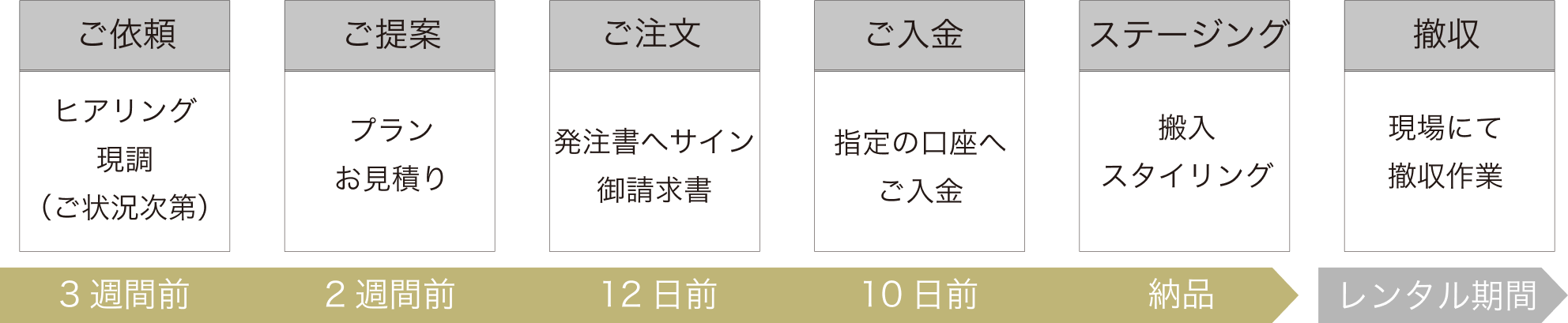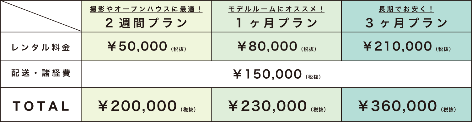 - ※上記3パターンのレンタルホームステージングの商品ないでしたら、最短1か月~単品でのお貸出しが可能です。